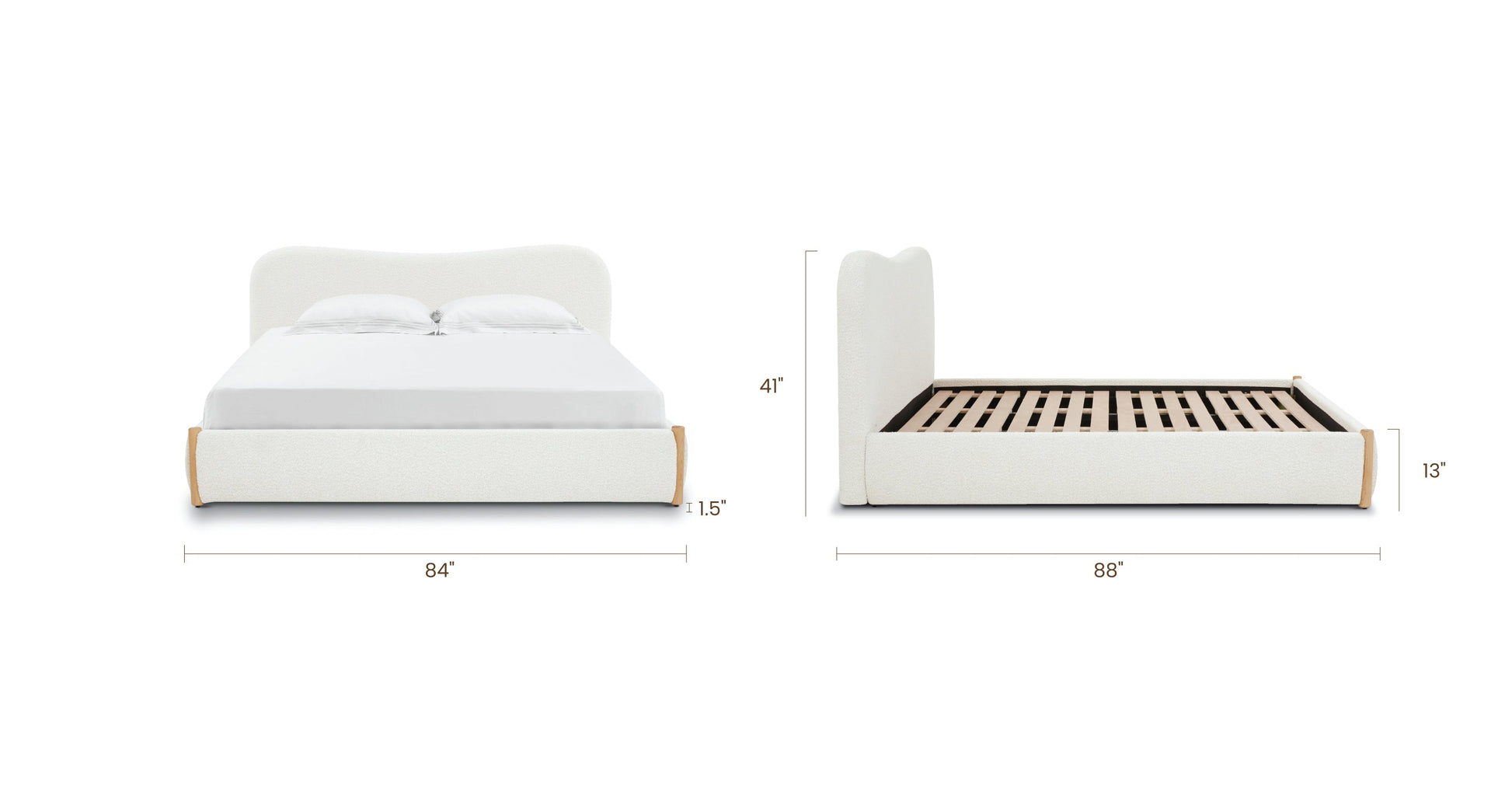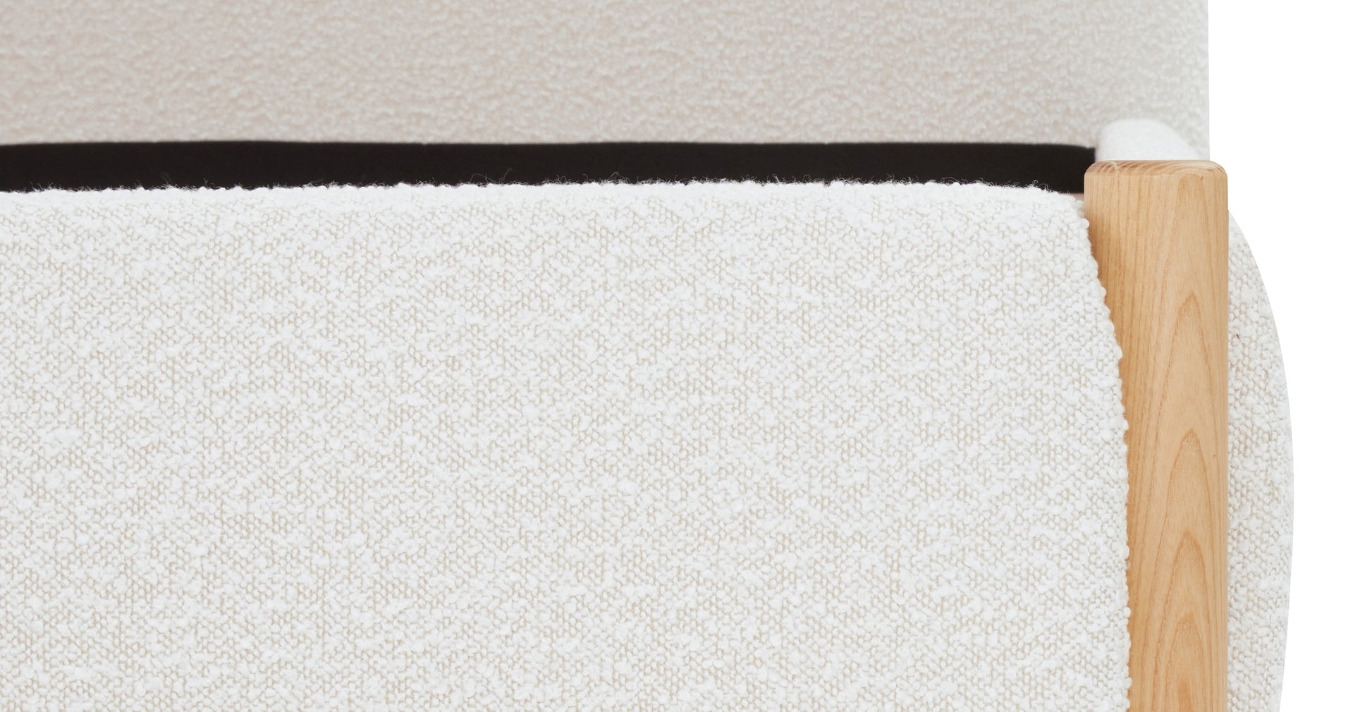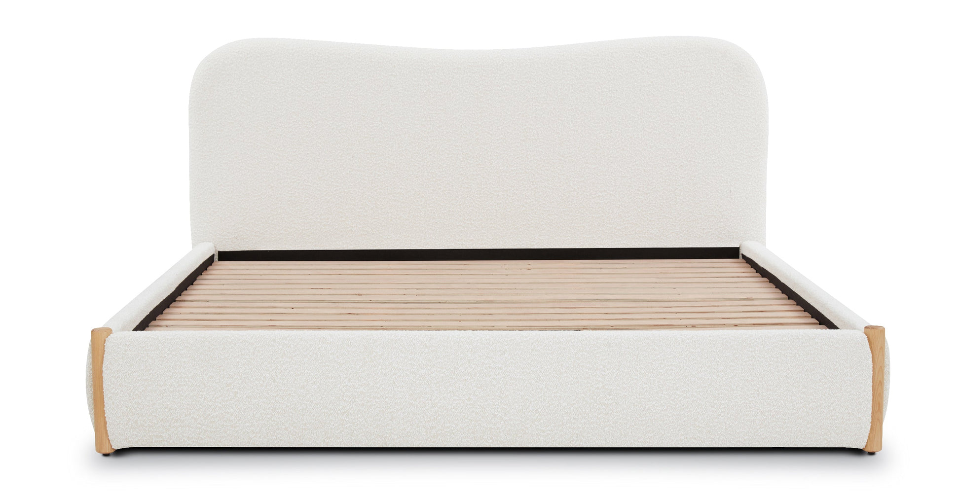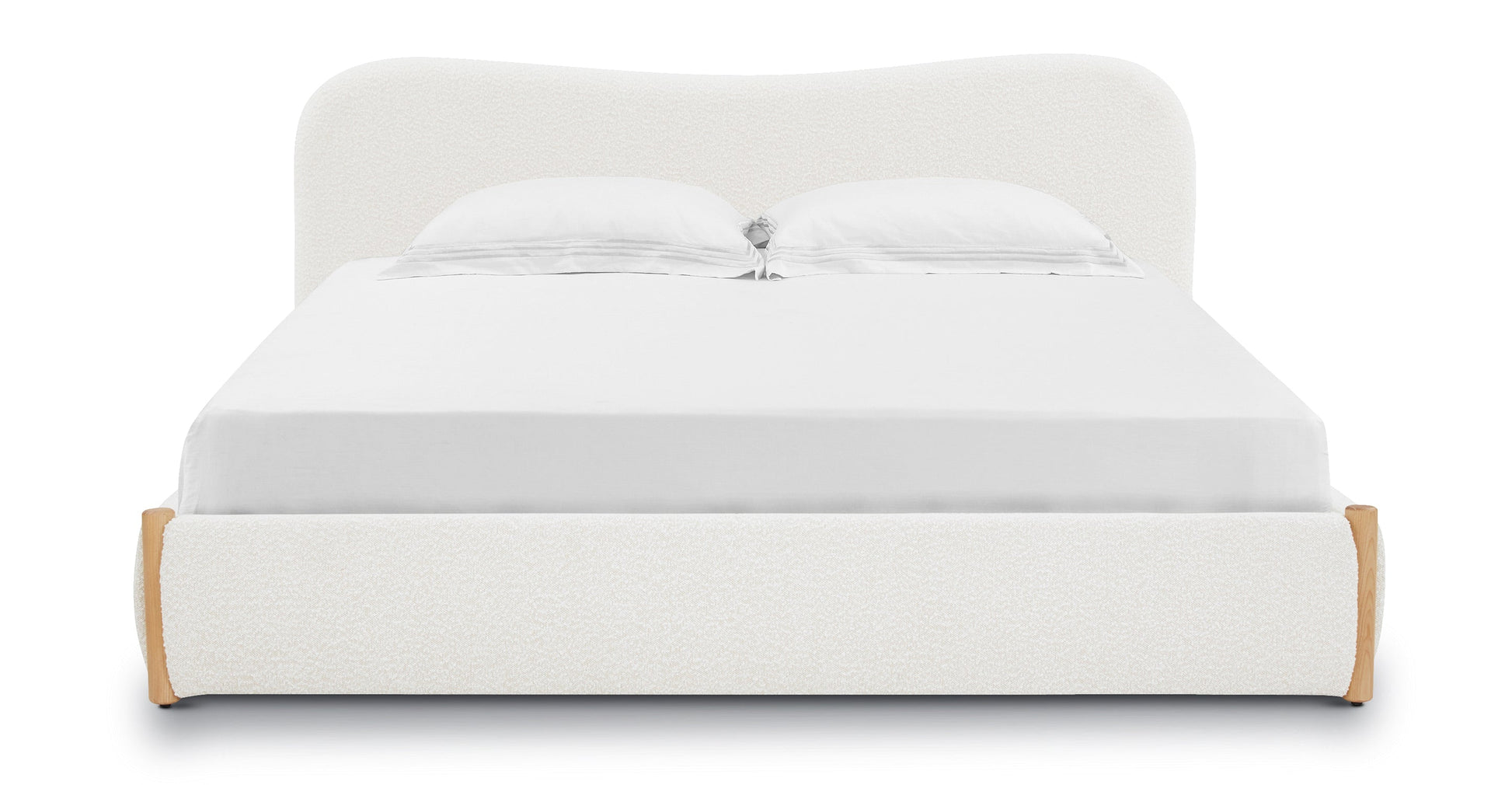 Ecco il letto che è un sogno come le tue mattine della domenica. Avvolto in un soffice bouclè bianco, è tanto resistente quanto elegante, e sopporta tutto, dalle macchie di caffè agli incidenti con gli animali domestici, come un professionista. Le gambe in rovere massello e il design senza rete a doghe lo rendono moderno, mentre la testiera imbottita garantisce il massimo comfort per ogni lettura notturna o maratona di Netflix.