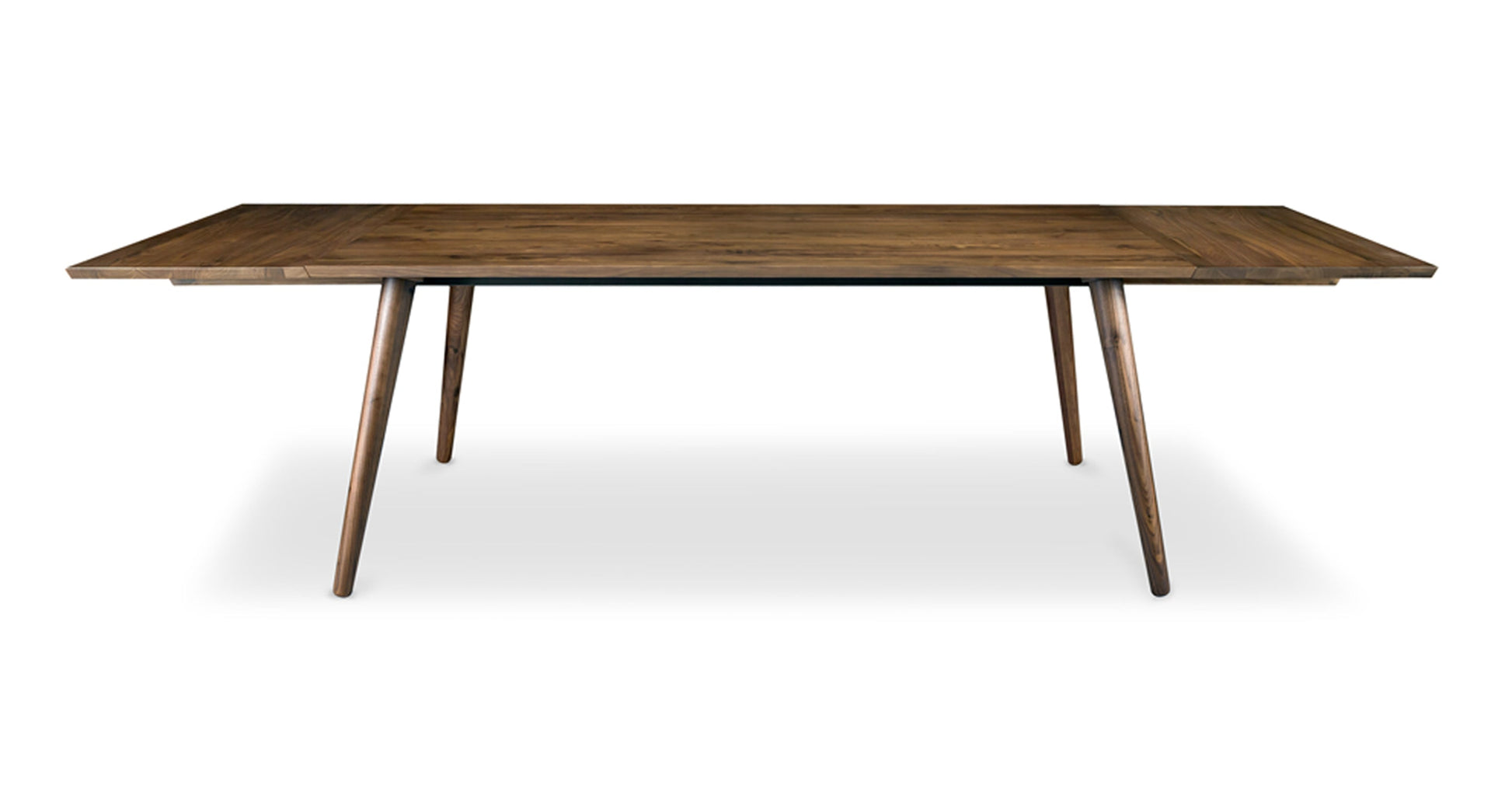 Cene e grandi colazioni in famiglia creano un'atmosfera invitante con questo tavolo da pranzo dal gusto retrò ma contemporaneo, dotato di prolunghe agganciabili a ciascuna estremità per gli ospiti. (Per vostra informazione: le prolunghe si possono riporre separatamente). Realizzato in massello di noce nero americano o rovere bianco americano, che ne esaltano le ricche venature naturali, vanta linee nette e angoli accattivanti. Le gambe arrotondate e affusolate si aprono leggermente per garantire robustezza e creare ampio spazio per 10 sedie da pranzo, che possono essere comodamente sistemate anche in 12, donando un tocco di spazio a ogni riunione.