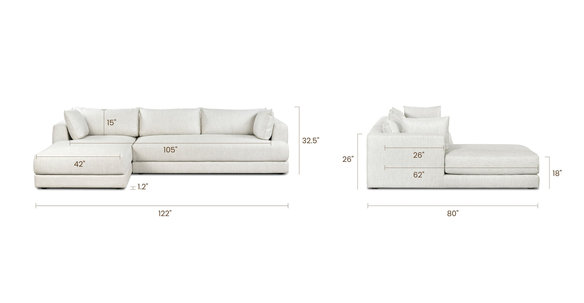 Dimensioni dei posti a sedere: 105'L x 62'P Chaise longue – 26'P Divano a due posti (fino al cuscino dello schienale) x 18'H