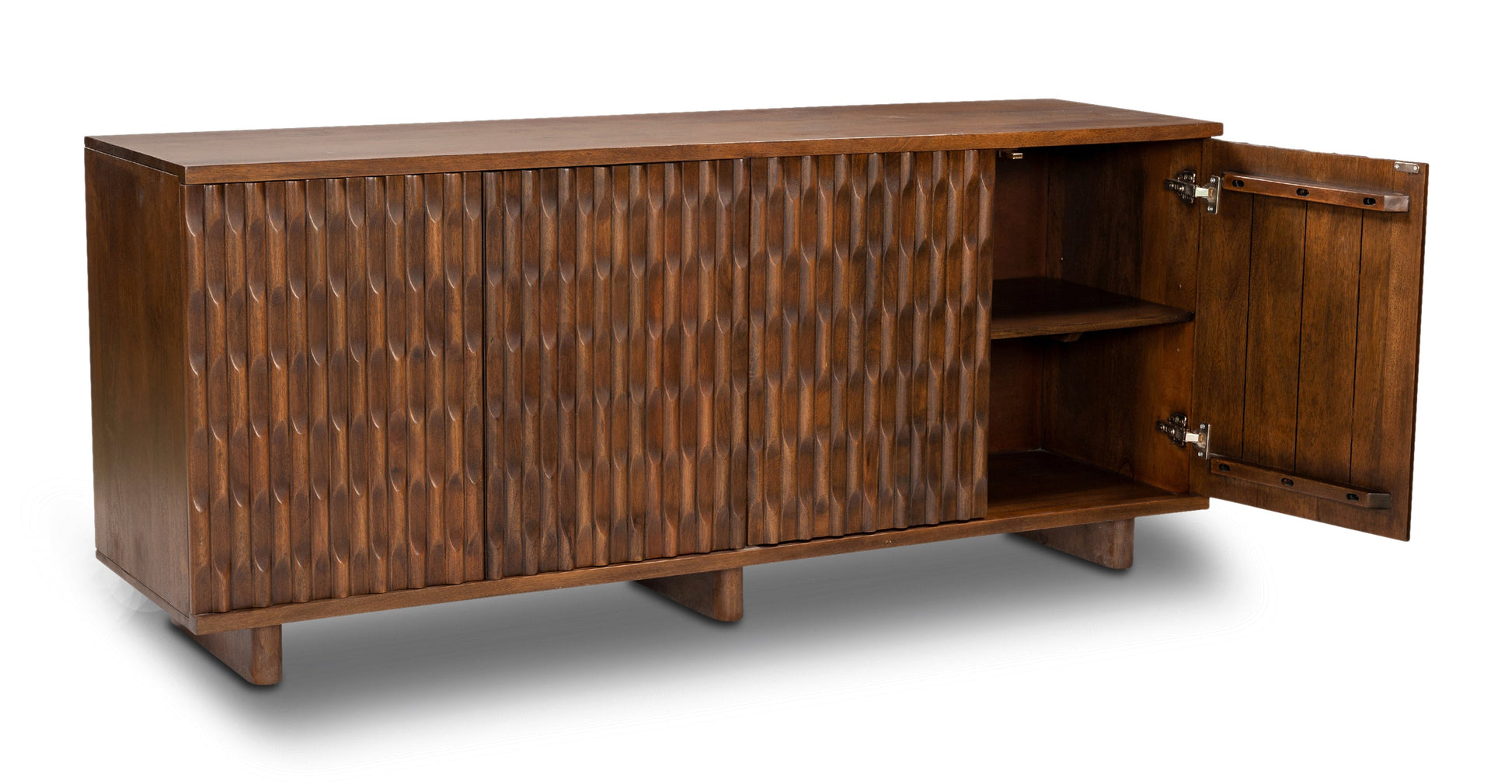 Dimenticate i buffet noiosi! Questa credenza d'ispirazione vintage è tutta un'opera d'arte. Le ante finemente intagliate nascondono ripiani regolabili (e forse qualche segreto!), mentre le cerniere a chiusura ammortizzata mantengono tutto al sicuro. Realizzata in legno massello di mango, ogni pezzo è unico e irripetibile. Qualcuno vuole un cocktail?